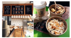 Para los desayunos solíamos ir a Haferkater, que estaba en la estación central. Es un mini café takeaway especializado en porridge (crema de avena). Tenían varias opciones veganas, nosotros escogimos la de plátano con chocolate y la de frutas del bosque con coco y chocolate. Perfecto desayuno para un día de turista 🙂