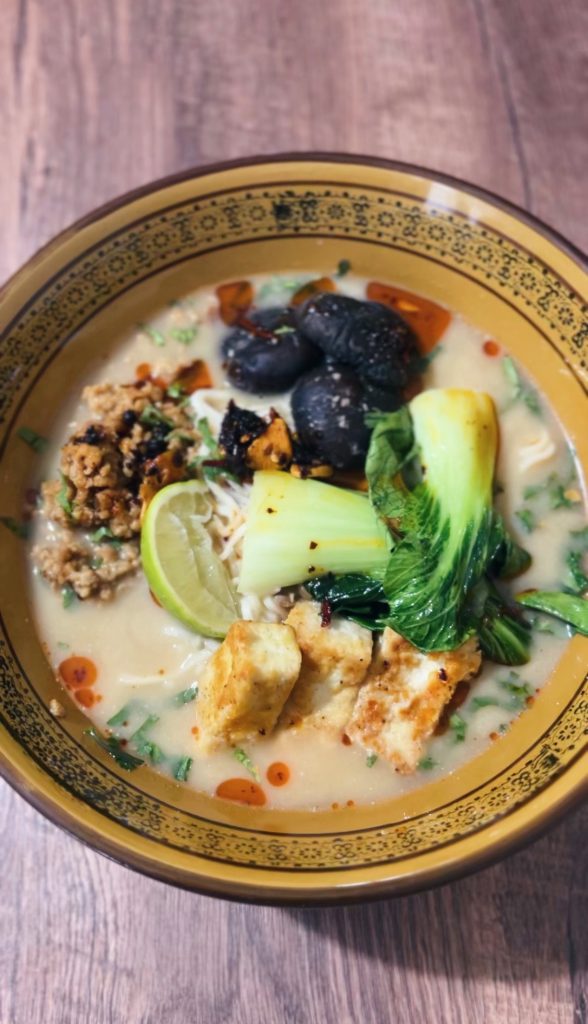 8. Por último, ponemos los fideos en un plato, añadimos el tofu, las setas y brócoli o Pak choy encima. Colamos salsa y la echamos por encima. También añadimos por encima la cebolleta, aceite picante y el zumo de media lima.