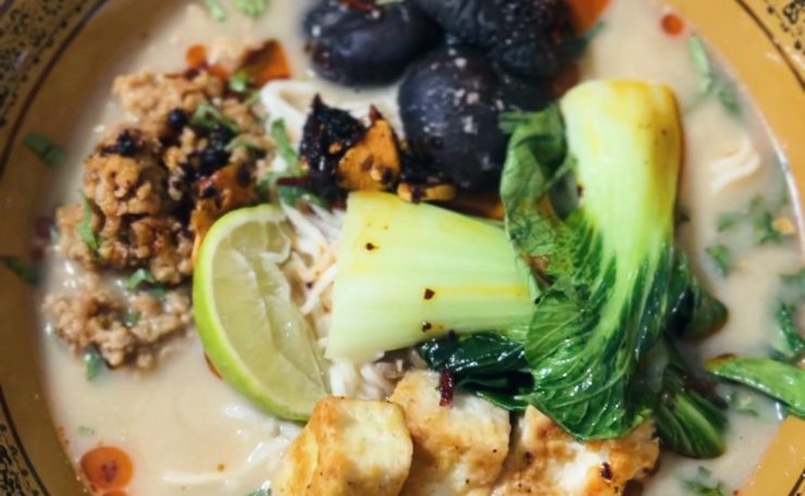 8. Por último, ponemos los fideos en un plato, añadimos el tofu, las setas y brócoli o Pak choy encima. Colamos salsa y la echamos por encima. También añadimos por encima la cebolleta, aceite picante y el zumo de media lima.