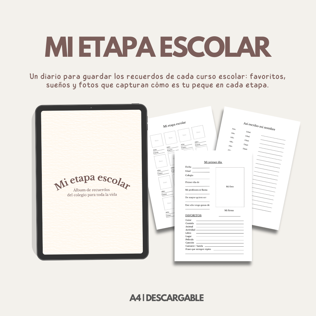 “Mi Etapa Escolar” es un diario diseñado para acompañar a tu hijo o hija durante cada curso escolar y convertir los pequeños momentos en recuerdos inolvidables.